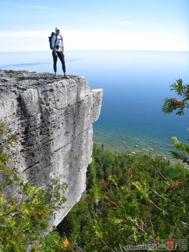 国家公园里最着名的景观就是Indian Head Cove,从Parking one到小峡谷有三条Trail可以选择,中间的Georgian Bay Trail是最容易的一条,而左边的Horse Lake Trail被称为风景最好。建议大家先从Georgian Bay Trail这条路去小峡谷,因为这条路不接近水边,峰回路转,最后穿出一片小树林,美丽的乔治亚湾突然展现在眼前的时候,那种绝美的景色会让你目不暇接,流连忘返。返回的时候可以选择Horse Lake Trail,这条路有一小段是沿着湖边的,所以可以和美丽的湖水多呆一会。另外,这条路不是水泥铺成的大道,有松软的树叶铺在地上,更接近大自然,也增加了Hiking的趣味性。