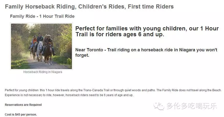 HorsePlay Niagara可算是多伦多附近最大的骑马景区。除了在trail里骑马前行,还可以在湖边骑马观赏湖岛景色。 提供不同的trail,从65一个人到上百一个人的都有。