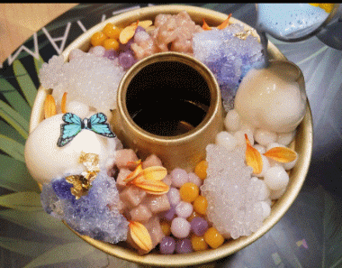 上桌后还会有仙气飘飘,吃前再淋上蓝色的蝶豆花椰奶炼乳,整个视觉和造型都太戳少女心了,甚至有点无从下嘴的感jio。
