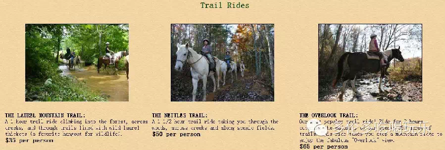 1993年经营到现在的一个家族经营的马场。提供了三条经典的骑马路线,每条路线的周边景色、时间、价格也不同。平均每人$35-$65。除了骑马,你还可以郊野度假,观光游览,湖边垂钓。