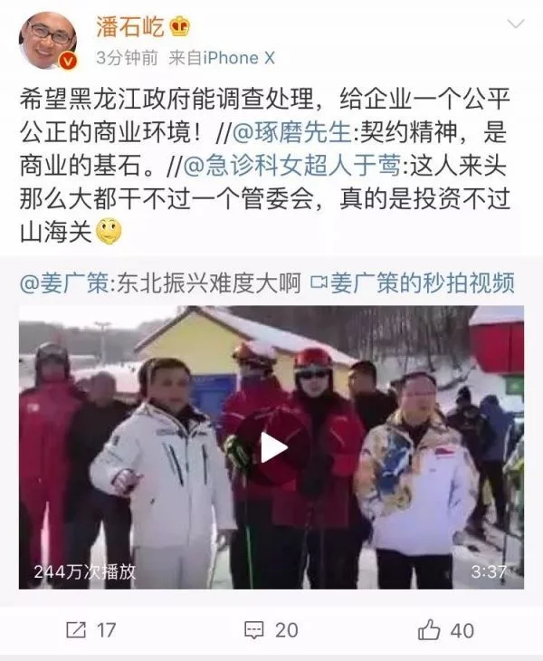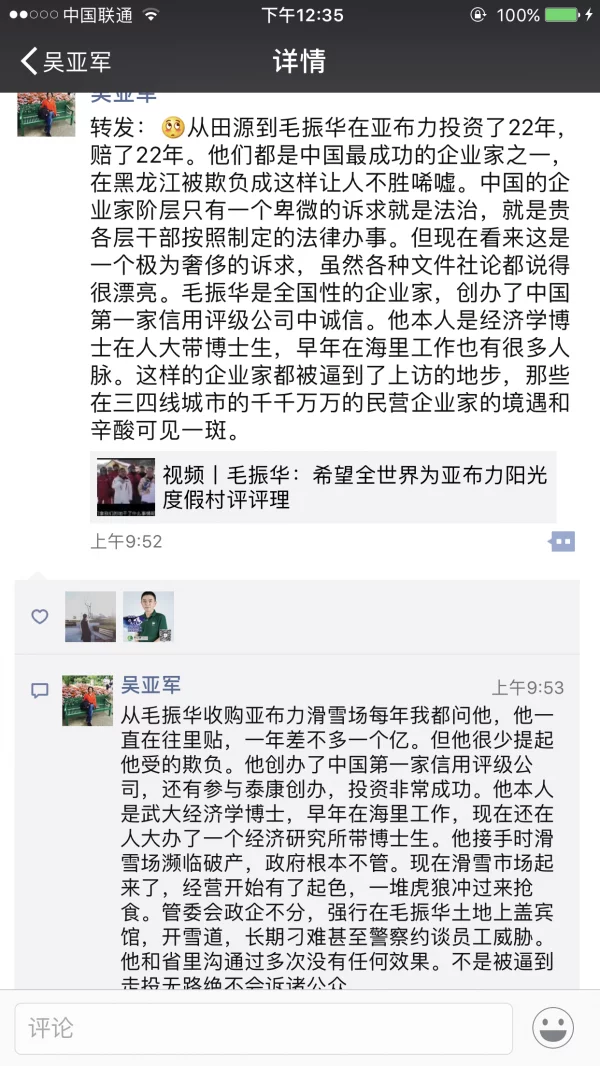 龙湖集团董事长吴亚军在微信朋友圈转发了他人的如下言论:“从毛振华收购亚布力滑雪场每年我都问他,他一直在往里贴,一年差不多一个亿。但他很少提起他受的欺负。他创办了中国第一家信用评级公司,还有参与泰康创办,投资非常成功。他本人是武大经济学博士,早年在海里工作,现在还在人大办了一个经济研究所带博士生。他接手时滑雪场濒临破产,政府根本不管。现在滑雪市场起来了,经营开始有了起色,一堆虎狼冲过来抢食。管委会政企不分,强行在毛振华土地上盖宾馆,开雪道,长期刁难甚至警察约谈员工威胁。他和省里沟通过多次没有任何效果。不是被逼到走投无路绝不会诉诸公众。”