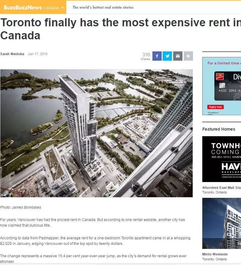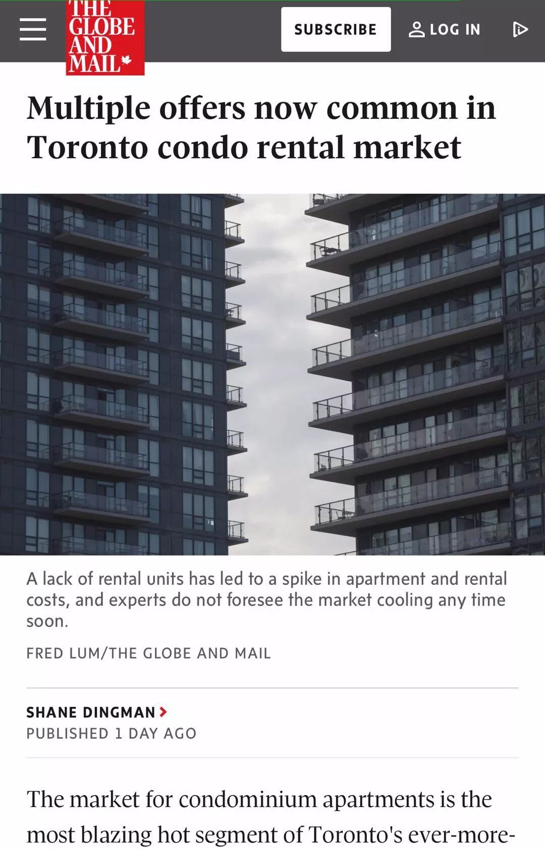 多伦多租房市场近来出现了疯狂火爆的场面,除了租金不断大涨,抢offer也成了常见现象。 据国家邮报(The Global and Mail)最新一篇报道指,多伦多人这些年来也许习惯了买卖房屋的抢Offer大战,但最近Condo出租市场也引发了竞价大战! 目前,通过房产经纪管理的MLS系统进行的Condo出租交易以往任何时候都多。据Urbanation Inc.的数据显示,光2017年在大多伦多地区通过MLS就出租27,200套Condo房单元,打破了历来纪录。 多伦多房租全加拿大最贵 特别是安省采取海外买家税新政之后,在加上贷款利率上涨及政策的调整,更像给多伦多地区的租房市场再添一把火,另多伦多一举成为全加拿大租金最贵的城市。 2018年1月的数据显示,多伦多平均月租金已经达到$2020,超过往年夺冠的温哥华。 有地产经纪表示,“多伦多目前房屋出租的市场已经失控。数年前也许你可以用 $1600-1700 的月租金租到一房一厅,但现在想都别想了,一房租金起码 $2050-2100美元,简直太疯狂了。 这名经纪并表示,自己每年大概会要帮客户完成200套左右的房屋出租交易,当我看到市中心好点的地区比如King West公寓列出1800的月租金出租时,我就知道价格叫低了,这肯定要抢Offer了。目前有很多这类公寓都以超过叫价出租,我曾遇过有客户给超过要价$250签的租约。” 在每年大约能完成200套柏文的租赁交易。她表示:“如果我看到一个位于King West的一套一卧室的柏文的租金要价为1,800元,我会知道这应该是叫低了,房东将会得到多个Offer,这些地方很多都会 1/5公寓出租会被抢Offer 根据Urbanation公布的最新报告显示,2017年第四季度,至少有17%房子出租时租金超过叫价。这么算下来每年有约五千套Condo会出现抢Offer的情况,占租户总交易量的1/5。而两年前,只有大约7%的租赁超过叫价。 据统计数据显示,最可能抢Offer的是一睡房单位,大约有20%这类出租单位会高出叫价,平均每月高出85元,或平均2,000元租金的4%。 专家:房价影响出租市场 针对这样的现象,有业界专家指出,多伦多2016年租金飙涨的原因是由于市场供求方面缺乏出租单元的库存。 租金增长趋势也和与Condo价格走势高度有关系。由于2016年和2017年初Condo的价格飞涨,所以使不少潜在买家望而却步而进入租房市场。 多伦多一家商业物业顾问公司SVN首席执行官Derek Lobo表示:“这一切都归咎于租房市场缺乏资源,30年的时间创造出来的问题需要至少15年才能解决。”他建议在多伦多多建新的出租物业大楼。他说,“在像多伦多这样的国际大都市,房屋的高价格已经成为现实,和类似其他城市相比(比如纽约)多伦多的租金和房价还是算低的”