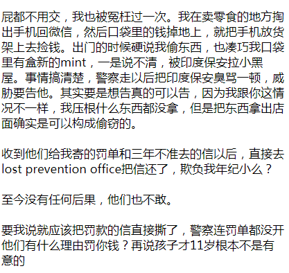 网友到书店的时候警察也到了,虽然一家人跟警察解释半天,警察的意思也是:虽然他本人相信小姑娘不会有这种行为,所以他不会给孩子任何犯罪罚单或警告,但是自己也没办法。警察也解释称,这种没有结账就走人的行为肯定会导致商店报案认定你是偷东西。 可是警察的话不好使,书店保安还是不依不饶,并且告诉网友,说他妹妹以后一年内都不能进店买东西,indigo也会寄一个罚款单,还威胁说,不交钱的话,就等着indigo告他妹妹吧! 孩子妈妈非常气愤,说罚多少钱无所谓,但是女儿无辜被冤枉是小偷,解释了问题还这样对孩子,很不公平。而且,据网友说,警察来处理问题的时候,感觉店员都用特别怪异的眼神看着一家子,而且临走的时候,还有白人老太太说他们“真丢脸”。