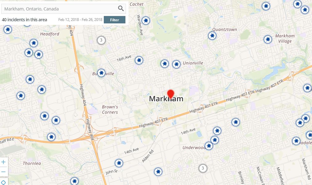 (约克区警局刑事犯罪地图,链接:http://www.yrp.ca/en/crime-prevention/Crime-Map.asp) 其中2月24日在万锦市凯旋(Carchet)社区居然还发生武装抢劫华人住家的案件。