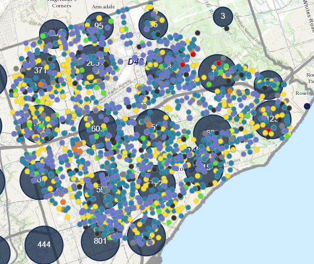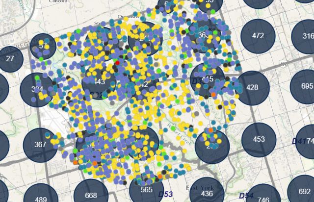 除了万锦市,根据多伦多警方此前公布的罪案高发区,华人著名聚居区士嘉堡和北约克全部上榜。 在士嘉堡社区,汽车盗窃(图中紫色点)案发生频率最高,其次是性侵案(蓝点)、入室盗窃案(黄点)等。