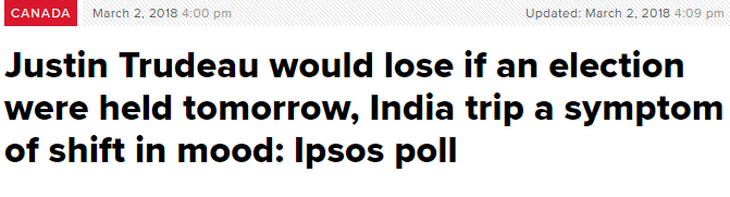最新民调显示,印度之行后,杜鲁多的自由党政府民意急转直下,如果现在举行大选,保守党将会胜出。分析师称,杜鲁多和自由党的支持率首次落后,是其自身造成的。