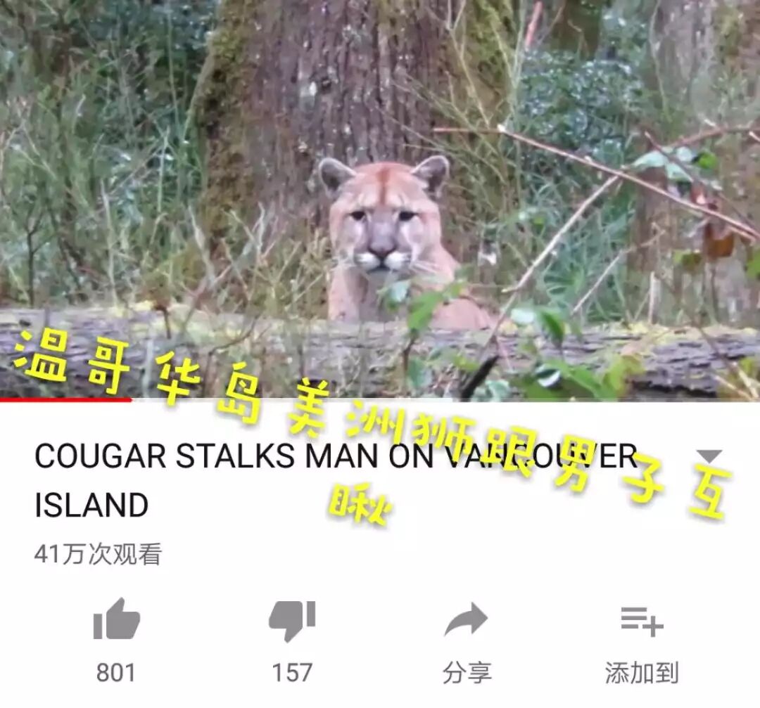 短短几天,这段视频在Youtube上的浏览量已经超过40万,小哥虽然很害怕,不过一边拍美洲狮一边解说的语气倒是不咸不淡很平和,真给人类长脸了。 快来一起看看Adam Bratsch“舍命”拍摄的现场视频↓↓↓ 其实,温哥华所在的卑诗省是北美美洲狮分布密度最高的地区,在森林中遇见美洲狮是很常见的事情,后院进客人也是常事。
