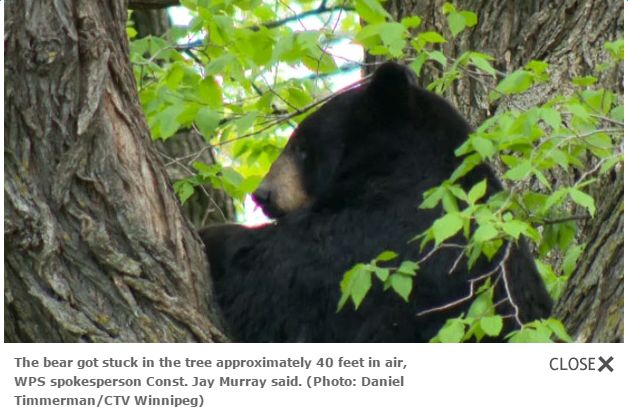 温尼伯某居民小区曾经有黑熊闯入,还爬上树,劝都劝不下来。