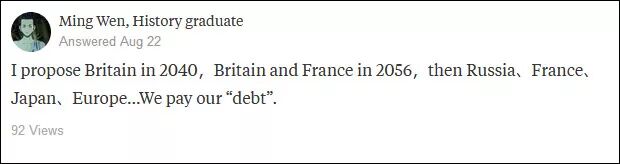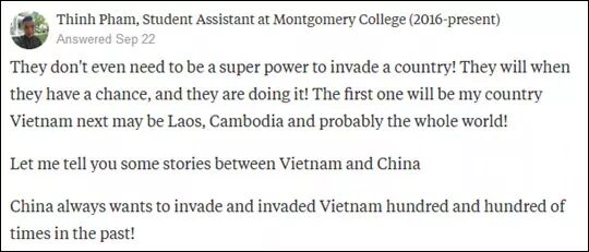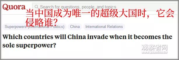 去年,就有英国网友在论坛上提出一个问题:古代中国很强大,为什么不统治世界?然后英国网友给出了各种各样千奇百怪的回答。 现在,美国版知乎Quora又出现了一个扎眼的问题:中国成超级大国后会侵略谁? 这个问题已获得了7.6万人的关注! 然后,中国答主Ming Wen的一个回答让他们吓坏了! 他说:中国将在2040年入侵英国,在2056年入侵英法,之后还有俄罗斯、日本、欧洲......因为有一笔帐要算。 不过最吓人的是这位越南答主Thinh Pham的回答:中国根本就不用等到变成唯一的超级大国再去入侵他国,现在他们就在这么做!越南将是中国的头号目标,然后是老挝、柬埔寨,接下来是整个世界…… 他列举了几篇外媒文章作为依据称中国在过去数百年间一直想要入侵......越南! 还一遍又一篇地强调,日本、越南、马来西亚、菲律宾、印度都已经遭到了中国的“毒手”…… 尽管这位越南网友控诉起中国来似乎“义愤填膺”,不过大部分网友似乎并不买他的账,因为多数人都认为,中国不会去搞入侵。 答主Raman说:中国在过去4000年里入侵的国家要比欧洲过去200年,美国过去70年里入侵的国家都要少。中国会用经济手段拿下东盟和非洲,但绝不会用武力。 答主Bevin认为:中国的领土扩张史还没有美国历史长,尽管中国在汉、唐、明时期都曾经是一个超级大国,但他却从来没有将其领土扩张。例如明朝时期,中国有着世界上最强大的舰队,他完全可以殖民北美洲、南美洲、大洋洲,没有哪个欧洲国家可以阻止他,但中国没有这样做,不是因为实力不够,而是不想。 答主Charlie One答案是:中国有一句古训:“国虽大,好战必亡。” 是的,国虽大,好战必亡! 但是,天下虽安,忘战必危! |