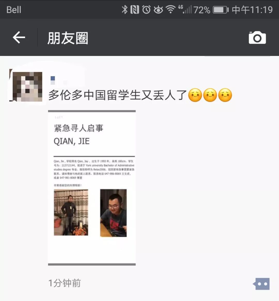 今天,一则“紧急寻人启事”在多伦多微信朋友圈中迅速扩散,据网友爆料称: “已经失联20天,所有能做的,能报警的都做了!”