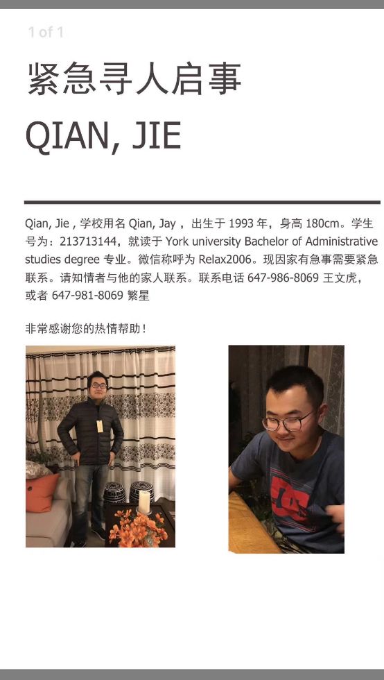 小编赶紧按照寻人启事上的联系方式电话联系了孩子的亲人王先生。 据了解,失踪的学生是王先生太太的外甥,2014年到约克大学读书,在自己家里最多住过4年。 家里人虽然有孩子的微信和电话,但是没有任何孩子同学或朋友的联系方式,所以在孩子突然失联后,能寻找的路非常之窄。 王先生说,最后一次联系孩子是3月5日通过微信,跟孩子说有关报税方面的问题。 由于Qian Jie没有按时报税,税局方面要求补报的deadline是3月9日。王先生的太太让Qian Jie把相关的材料都拿到家里来,帮他一起报。当时一切都很正常,孩子回复的最后一个词是“好”。