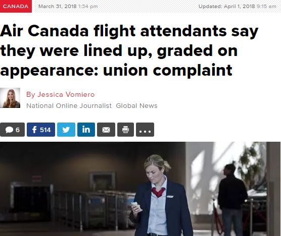 其实,这里是加航(Air Canada),而且一个月前加航就被代表8,500名空乘的员工工会上告到加拿大人权法庭,加航被指控进行“系统性歧视和性骚扰”。