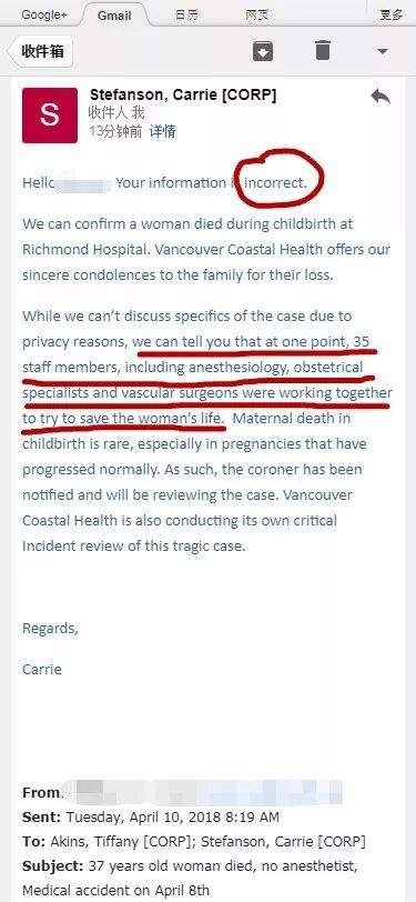 温哥华沿岸卫生局(Vancouver Coastal Health, VCH)公共事务负责人Stefanson在回复51网记者的邮件中却明确表示,记者获得的信息是完全错误的。 他称虽然由于隐私原因,不能讨论事件的详细经过,但是卫生局唯一可以说的是:当晚35名参与救治产妇的麻醉师,产科专科医生和血管外科医生等医务人员,均曾尽全力挽救刘女士的生命(红色标注部分)。