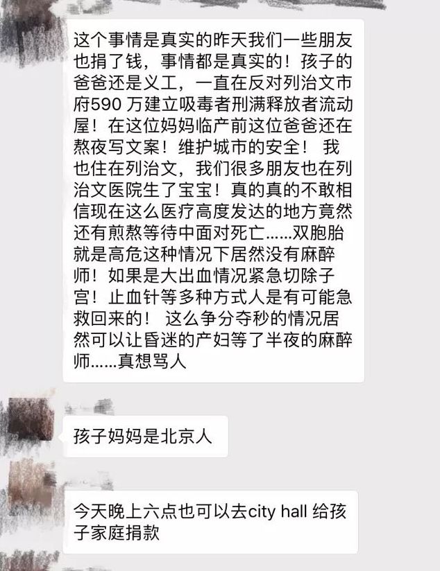 死者朋友们的无奈 中国驻温哥华领事馆和联邦国会议员均为刘女士家属的入境签证的办理提供了帮助,以便尽快前来办理后事。 有生产经验的网友们对此事也纷纷发表自己的评论,可以看出加拿大医院麻醉师不足确实存在很大的问题: @小雷音:“我当时生孩子就是周五晚上,所以一直没有麻醉师,从10点多嚎叫到早上5点半麻醉师才来,上了麻醉立刻睡着一会儿,但我老公跟护士大声说话7点我就被吵醒了。” @kent88:“医院没有24小时的麻醉师。产妇半夜生孩子大出血,需要手术,没有麻醉师,需要现call。大出血很危险,不及时手术救回来的概率很小。” @mecca:“她生的时候是周末晚上,估计麻醉师人手不够,一周5天,很多医生不是8小时到点就下班的,一天超过12个小时的也常有,周末就回家休息了。这种情况就是有急症就on-call。一般情况下都来得及。” @清风拂面:“其实分娩是极其危险的事,前置胎盘如果不小心就会引起这样的大出血,几乎都是九死一生哪怕医生就在身边也无能为力的。” @steven2000:“提个醒:大龄双胞胎母亲应该选择BC Women's Hospital,不应该选择低等级Richmond Hospital医院接生。” @大温小雯:“大出血三五分钟人就没了,很多情况在手术台上都救不活,产科夜间不配麻醉师,真是开玩笑。” @amoy-limai:“想到我的孩子都已经快出来的那一刻,身边除了我老公以外就一个护士在对着隔壁正在准备器械的护士喊:baby is coming...喊半天都没有人过来……” 据悉,发起爱心筹款的Caryn已开设捐款专用联名账号,邮件转账已经设置成自动存款。微信和支付宝受到的捐款会同意转入联名账户,加元邮件转账邮箱为victordonation@gmail.com。爱心人士提供帮助也可致电:778-892-1228 愿逝者安息 R.I.P