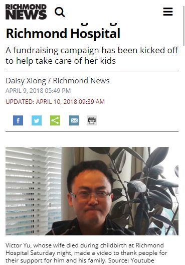 当地媒体也已报道此事 原来,余先生的妻子刘女士(Liu Wei)于4月8日凌晨到列治文医院分娩,生下第一个宝宝后突然大出血,最终没能醒来,准妈妈连刚出生的孩子也没看到一眼,就与亲人们阴阳两隔。