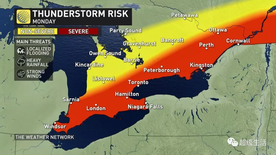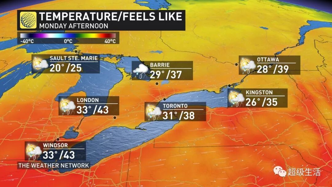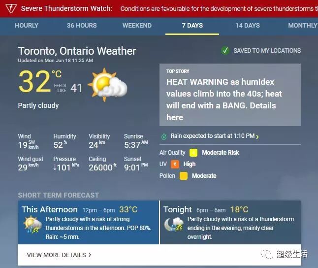 照理来说 多伦多要到6月21日才正式入夏 可是这两天的天气已经是 热! 热! 热! 热爆表~ 比热还难受的 是闷+热 今天就是这种情况~ 加拿大环境部表示 早前发出的炎热警告(heat warning)仍然有效~ 多伦多目前体感温度41℃左右! 下午还可能继续升高。。。 幸运的是 环境部昨天发出的空气质量特别预警 (special air quality statement) 在昨晚9点半左右结束! 大家终于可以舒坦地喘口气。。。 然而…不幸的是 加拿大环境部门早上11点最新发出了 强雷暴预警!(Severe Thunderstorm Watch) 又一场强风大雨+大冰雹的强雷暴 正在向多伦多袭来 可能会有破坏性的时速100公里的强风~ 并且在一小时内有25至50毫米的暴雨! 环境部警告 冰雹可能会损坏建筑物! 强风也可能吹坏不坚固散的物体和树 甚至推翻大型车辆~ 雷雨天气同时可能伴有闪电 严重的雷暴也可能产生龙卷风! 你们以为下雨天就会凉快? 简直是想太多~ 想象一下, 一边40度+酷热,一边还要暴雨! 大家可以好好感受一下 下开水的节奏! 妥妥的天然“蒸桑拿”啊~ 但要小心别被雨烫着,真的…… 密西沙加已经有人遭遇到了 多伦多也有! 这种天气。。。 天晴,我为自己带盐 下雨,我为自己带伞 其实伞在这种大风天是没用的 你要能撑开的话,估计也连人带伞被吹上天了! 好在多伦多在这场“桑拿”雷暴之后 今晚开始会有所降温 明天起大家就可以舒一口气了… 超级君只想说 大家如果今儿个一定要出门的话 一定注意防暑,防大雨,防被吹走… 没事还是在好好家 吹空调吃西瓜看世界杯吧~