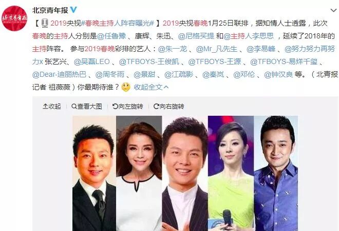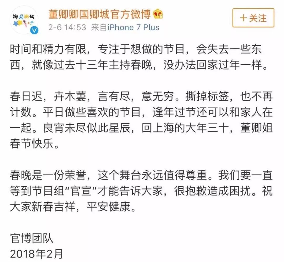 今年除夕,正好是立春 除夕是农历中一年的最后一天,立春是二十四节气中的第一个节气。 天文教育专家表示,农历己亥猪年从2019年2月5日一直到2020年1月24日,猪年共有354天,和即将过去的狗年一样也是一个平年。 除夕和立春在过年时巧遇的情况,并不多见,大约一百年当中会出现5年,而除夕和立春在同一天的情况,大约百年当中只有三年出现。 2019年2月4日,2057年2月3日,2076年2月4日,都是除夕当天逢“立春”。 而2038年2月4日、2087年2月3日这两天都是大年正月初一立春。 除夕,你是怎么过的?看春晚了吗? 2019年春晚主会场的主持人是任鲁豫、康辉、朱迅、尼格买提、李思思。 和去年一样,董卿依然没有主持春晚,令不少网友感到难以接受。 从2005年至2017年,董卿在春晚的舞台上走了13年,春晚没有董卿的第二年,话题#好想董卿#又被刷上了热搜。 欢声笑语背后 是一个人孤独的吃速冻水饺 说起董卿,首先想到的一句话就是:“若有诗书藏在心,岁月从不败美人。” 她沉着冷静,谦卑优雅,落落大方,身上那股清新隽永的灵气,只要站在台上一开口就让人感觉如沐春风。 所以,2005年到2017年,连续十三年,每届春晚的舞台上,有她在你总是会感到特别地安心。 如今,没有董卿在的春晚,总让人感觉缺了一角。 董卿不再上春晚主持了,不少网友都觉得惋惜,倪萍经纪人更是微博发问“春晚的标准到底是什么”,来为董卿打抱不平。 但其实没有那么黑幕,董卿退出春晚的原因,是自己想在除夕这一天在家过年,想要多陪陪家人。 去年董卿接受采访时就曾说:“春日迟,卉木萋,言有尽,意无穷。” 借用这首《诗经》里的典故,来表达自己想回归家庭的意向。 2005年,春晚最后一个歌舞节目结束后,董卿和其它三位同台主持人一起说着录完节目准备去干嘛? 朱军说:“我家有一帮朋友等着我回去喝酒呢。” 周涛说:“我爸妈包好了饺子在家等我,都催好几次了。” 李咏说:“我已经跟媳妇买好了去度假的机票。” 只有董卿,却愣住了,她的家,在1200多公里之外的上海。 别人都回家过年的时候,她只有一个人远在北京,孤苦伶仃: “我觉得自己挺可怜的,我不知所措,完全不知道自己要干什么。” 每年除夕,当我们一大家子围着圆桌吃团圆饭,欢声笑语中看春晚时,而陪伴董卿的,每年都是一盘速冻水饺。 撒贝宁说:“有时候你看董卿的背影,会觉得她挺孤独的。” 或许这就是主持人的宿命,台上越是绚烂光鲜,台下越是寂寞冷清。 她在春晚舞台陪了我们13年,现在我们也应该让她去陪陪家人了。 聪明的人 懂得工作和家庭的取舍 同样主持了13届春晚的倪萍,曾对董卿说过这样一段话: “不管你现在多孤独,多寂寞,多么没有男朋友,多么没有钱,多么没有家,多么没有爱,多么没有温暖,都特别值。 因为不是每一个人都有机会做中央电视台这个综艺舞台上的核心、光亮最聚焦的地方的主持人,这是你的运气,也是你的机会。” 春晚作为最顶级的舞台,董卿、倪萍等一大批主持人都曾为它无悔过,但台上万众瞩目,台下寂寞无助,曾经鼎盛一时,总有落幕的一天,怎么平衡和面对? 现在,董卿给出了她的答案,她说:“一个聪明的人不仅仅知道,她什么时候该上场,还要知道她什么时候可以离开。离开的时间,决定的是你看大家的背影,还是大家看你的背影。” 所以,董卿可以在14年暂别央视,以访问学者的身份赴美进修,也能在18年告别春晚,陪家人好好度过一次除夕。 聪明的人,都懂得如何取舍,不在低谷自怨自艾,也敢于在顶峰舍得放下,有自己的人生规划,不盲从,不随从。 孙俪,同样是一位懂得取舍的女人。 去年年初,孙俪在微博上发了一条微博,说经纪人要来商量下工作安排,没想到孙俪先将一军直接告知了自己的旅行计划。 经纪人很无语,只能合上本子啥也没说就走了。 翻开她的微博,你会发现她不是在宣传新剧,不是在为自己拉票,她大部分时间都是和家人在一起,在经营生活。 一家人一起养猫养狗,画画做手工,泡脚养生,外出旅行,亲近自然…… 那些寻常生活中的小幸福,她一样没落下。 在去年的飞天奖典礼,孙俪站在台上发表获奖感言时说: “人生要懂得取舍,你在年轻的时候,有很多时间可以去尝试,长大之后你就越发知道哪些事情不可以做,哪些事情可以坚持做下去。” 为什么娱乐圈那么多明星的婚姻家庭走不下去,而孙俪却能过得有声有色,我想这已经是最好的答案。 对一个女人来说,什么是所谓人生赢家? 是拥有很多,但懂得取舍; 是进可以创事业拼天下,退可以洗手持家相夫教子; 是对生活和事业的节奏,拥有绝对选择权和自主权。 人生赢家从来不是得到所有,而是得到你最想得到的,并且知足。 孙俪为大儿子取小名“等等”,念过心经的就知道,这出自《心经》中的“是无等等咒”。 “是无等等”意思是:对也好,错也好,得到也好,失去也好,都不过如此。 人生没有绝对的得到和失去,得失坦然,懂得取舍,才能微笑面对生活。 真正的成功,是陪伴家人。 现在很多人追求所谓的成功,在他们的价值观里,强大的事业、足够多的金钱、海量的粉丝才是成功。为了所谓的成功,每天马不停蹄,疏忽了对家人的陪伴。 嘴里永远都是:“爸妈这周末忙,下周一定带你去游乐园”;“等我忙完这个项目,我们家就出去好好玩一趟”;“等我成功后,我会你最好的”;…… 你连陪家人的时间都没有,你算屁成功? 一个人,努力上进是