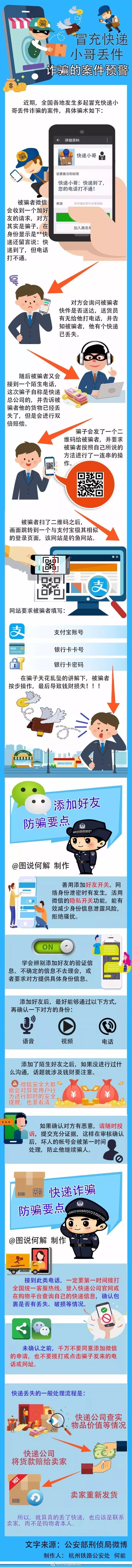 而且这种骗子不是一个两个,也不只是通过打电话方式诈骗, 还有利用加微信号, 声称自己是xx快递, 然后发个二维码, 不了解的人可能以为是快递公司发跟自己直邮包裹相关的信息就识别二维码,然后一旦被用户识破就赶紧拉黑对方,继续去欺骗其他人了。 据了解,目前已经有多家知名快递公司都收到有客户反馈,接到这类不明电话通知说发送的快递丢失,不明电话通知可说出收件人的快递单号及地址,并需要收件人提供银行账号密码等相关信息,最后这些不明电话都被核实,实际上就是网络、电话诈骗。 包括网上随便一搜,关于这样被冒充快递公司的骗子诈骗成功的真实案例还真不少, 案例一: 邵女士报案称其接到冒充某快递公司工作人员的电话,对方告知其快递丢失,打算提供全额理赔,但要求邵女士添加微信。随后,邵女士按对方要求在网上银行进行贷款,并通过扫描对方提供的二维码付款一万余元。 案例二: 罗女士接到快递公司工作人员的电话,称其快递丢失,要给予赔偿,罗女士添加对方微信后点击对方发的链接,按要求填写了银行卡账号和密码后,输入验证码,随即发现银行卡被转走一万余元。 有快递公司发布紧急通知,提醒广大客户切勿轻信此类电话通知,更不要告知身份证、银行等相关信息。 虽然快递丢失不是不可能,但快递公司的丢件理赔等问题,通常都会通过官方渠道以邮件方式通知客户, 是不会要求客户提供 任何银行、支付宝、微信账户等重要信息。 如果接到这种电话,首先是不要惊慌,不要立刻相信对方说的关于快递丢件理赔的事去进行一系列的操作, 其次客户可以自行联系快递公司官网上的客服电话进行核查,又或者客户可以立刻联络自家代购,让代购直接联系当地快递公司查询。 近期这类诈骗尤为猖狂, 广大代购朋友们记得赶紧提醒自家客户, 千万别上当受骗!! 最后随手给大家附上一张图, 带你识破“假快递小哥”的诈骗圈套,