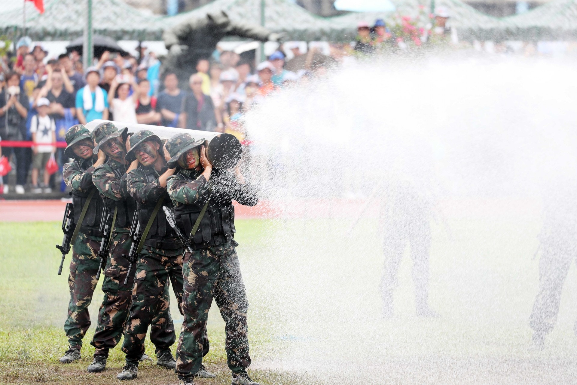 《新华社》周一(12日)报道,近日广东公安夏季大练兵,"深圳亮剑"行动在深圳宝安海滨广场举行。报道指该次大练兵行动,旨在以训促战,全面提升实战能力,深圳市公安机关展开了反恐处突、海空联合巡逻、防暴等三个科目的演练。现场所见,有1.2万名警力整齐集结,50辆装甲车、200辆沖锋车、1200台铁骑摩托车、5架直升机、8艘船艇、2辆水陆两栖车以及其他装备分列周围,海陆空警种齐上阵。