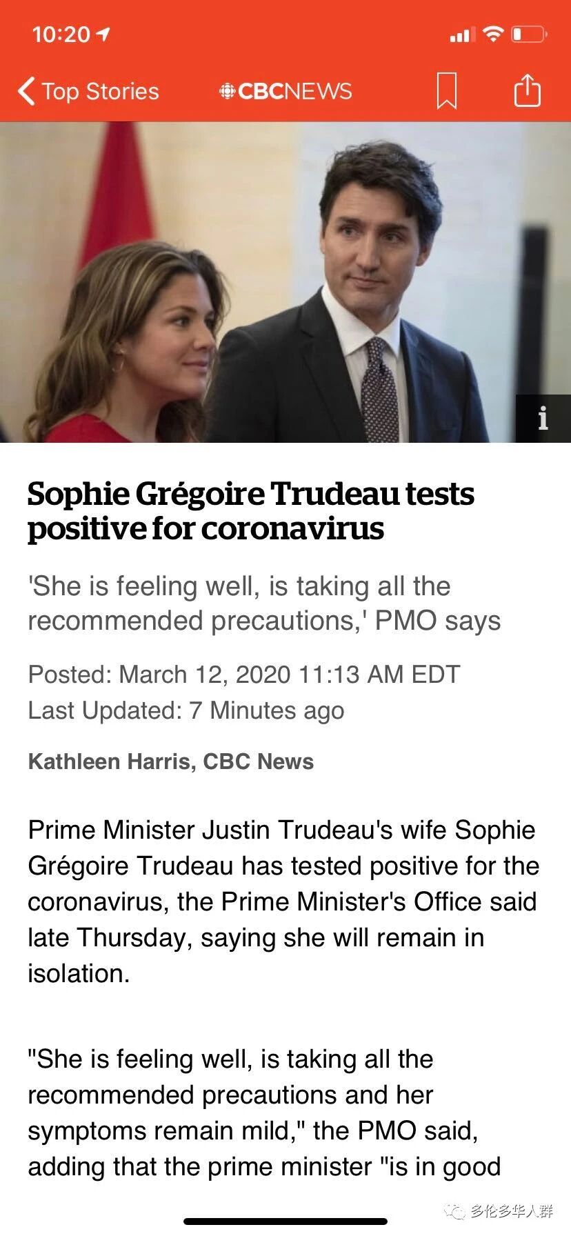加拿大总理小土豆老婆确诊,总理小土豆隔离! 加拿大主流媒体CBCNEWS报道! 据美联社报道,加拿大总理特鲁多的妻子索菲新冠病毒检测呈阳性。 特鲁多办公室在一份声明中确认了这一消息。声明称,索菲目前感觉还好,仅出现了一些轻微的症状,她将继续隔离接受治疗。总理特鲁多目前并未出现任何症状,但也将隔离14天。 据CNN报道,由于并未出现任何症状,特鲁多暂未接受新冠病毒检测,将继续如常履行职责。 此前,由于妻子出现“流感症状”,特鲁多和妻子索菲主动进行自我隔离。 长按二维码关注 附近大众群 长按二维码关注 附近大众群 |