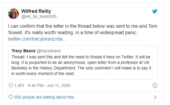 昨天在英文社区有一封公开信像地下的野火一样,疯狂地在传播。 文章很长很长,半天时间就有46万多阅读,这在英文社区里面非常罕见。这篇文章,已经有伯克利教授确认了这封信是真的。 我们先贴原文,译文在后: UC Berkeley History Professor's Open Letter Against BLM, Police Brutality and Cultural Orthodoxy Dear profs X, Y, Z I am one of your colleagues at the University of California, Berkeley. I have met you both personally but do not know you closely, and am contacting you anonymously, with apologies. I am worried that writing this email publicly might lead to me losing my job, and likely all future jobs in my field. In your recent departmental emails you mentioned our pledge to diversity, but I am increasingly alarmed by the absence of diversity of opinion on the topic of the recent protests and our community response to them. In the extended links and resources you provided, I could not find a single instance of substantial counter-argument or alternative narrative to explain the under-representation of black individuals in academia or their over-representation in the criminal justice system. The explanation provided in your documentation, to the near exclusion of all others, is univariate: the problems of the black community are caused by whites, or, when whites are not physically present, by the infiltration of white supremacy and white systemic racism into American brains, souls, and institutions. Many cogent objections to this thesis have been raised by sober voices, including from within the black community itself, such as Thomas Sowell and Wilfred Reilly. These people are not racists or 'Uncle Toms'. They are intelligent scholars who reject a narrative that strips black people of agency and systematically externalizes the problems of the black community onto outsiders. Their view is entirely absent from the departmental and UCB-wide communiques. The claim that the difficulties that the black community faces are entirely causally explained by exogenous factors in the form of white systemic racism, white supremacy, and other forms of white discrimination remains a problematic hypothesis that should be vigorously challenged by historians. Instead, it is being treated as an axiomatic and actionable truth without serious consideration of its profound flaws, or its worrying implication of total black impotence. This hypothesis is transforming our institution and our culture, without any space for dissent outside of a tightly policed, narrow discourse. A counternarrative exists. If you have time, please consider examining some of the documents I attach at the end of this email. Overwhelmingly, the reasoning provided by BLM and allies is either primarily anecdotal (as in the case with the bulk of Ta-Nehisi Coates' undeniably moving article) or it is transparently motivated. As an example of the latter problem, consider the proportion of black incarcerated Americans. This proportion is often used to characterize the criminal justice system as anti-black. However, if we use the precise same methodology, we would have to conclude that the criminal justice system is even more anti-male than it is anti-black. Would we characterize criminal justice as a systemically misandrist conspiracy against innocent American men? I hope you see that this type of reasoning is flawed, and requires a significant suspension of our rational faculties. Black people are not incarcerated at higher rates than their involvement in violent crime would predict. This fact has been demonstrated multiple times across multiple jurisdictions in multiple countries. And yet, I see my department uncritically reproducing a narrative that diminishes black agency in favor of a white-centric explanation that appeals to the department's apparent desire to shoulder the 'white man's burden' and to promote a narrative of white guilt. If we claim that the criminal justice system is white-supremacist, why is it that Asian Americans, Indian Americans, and Nigerian Americans are incarcerated at vastly lower rates than white Americans? This is a funny sort of white supremacy. Even Jewish Americans are incarcerated less than gentile whites. I think it's fair to say that your average white supremacist disapproves of Jews. And yet, these alleged white supremacists incarcerate gentiles at vastly higher rates than Jews. None of this is addressed in your literature. None of this is explained, beyond hand-waving and ad hominems. "Those are racist dogwhistles". "The model minority myth is white supremacist". "Only fascists talk about black-on-black crime", ad nauseam. These types of statements do not amount to counterarguments: they are simply arbitrary offensive classifications, intended to silence and oppress discourse. Any serious historian will recognize these for the silencing orthodoxy tactics they are, common to suppressive regimes, doctrines, and religions throughout time and space. They are intended to crush real diversity and permanently exile the culture of robust criticism from our department. Increasingly, we are being called upon to comply and subscribe to BLM's problematic view of history, and the department is being presented as unified on the matter. In particular, ethnic minorities are being aggressively marshaled into a single position. Any apparent unity is surely a function of the fact that dissent could almost certainly lead to expulsion or cancellation for those of us in a precarious position, which is no small number. I personally don't dare speak out against the BLM narrative, and with this barrage of alleged unity being mass-produced by the administration, tenured professoriat, the UC administration, corporate America, and the media, the punishment for dissent is a clear danger at a time of widespread economic vulnerability. I am certain that if my name were attached to this email, I would lose my job and all future jobs, even though I believe in and c