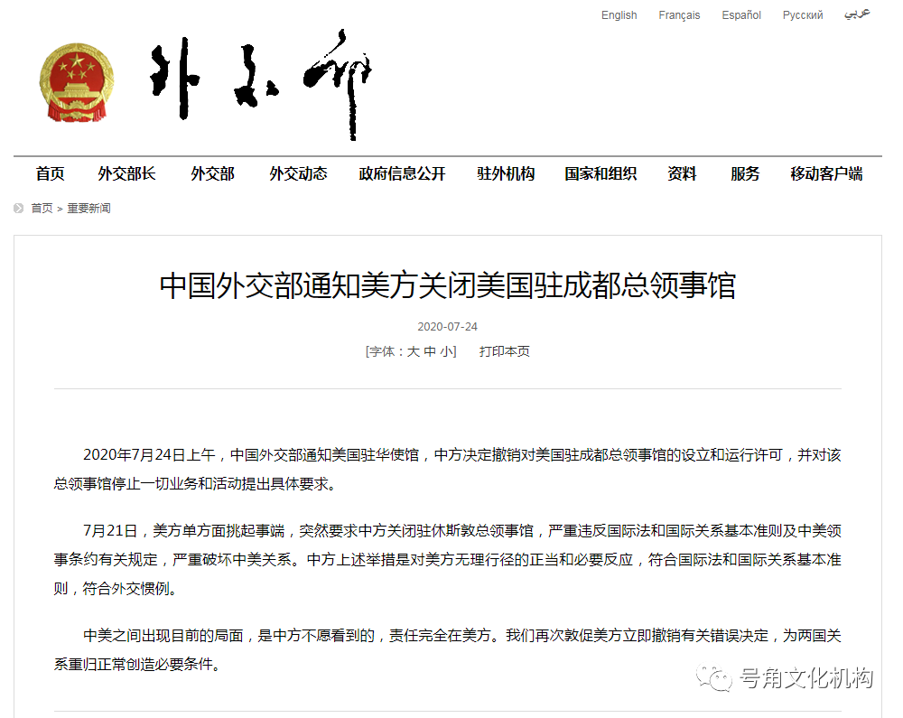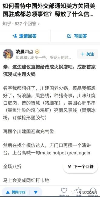 这两大家极其关注的一件事,无疑是外交部通知美国关闭驻成都总领馆。外交部的通告是这种风格的: 可是,在见过大世面的成都人民面前,一个极其严肃的国际政治外交事件,竟然生生玩儿成了一幕喜剧: 据说今天大量的成都社畜放弃了上班,纷纷奔向总领馆周围强力围观,有消息称重庆方面的兄弟姐妹中午得到消息之后立即出发,得益于两个小时左右的动车,他们也在围观的人流之中: 有探讨原因的: 有编笑话的: 有操心帮米帝卖房子卖车的: 也有想好这个地方的后路的: 更有苦口婆心提出意见的: 各位段子手怎么会缺席? 成都的弟兄这次非常自豪:因为休斯顿是美国第四大城市,所以由此证明成都也是中国第四大城市…… 就连一直严肃的央视,这次也玩儿起了梗,他们架设了几台摄像机在美国驻成都总领馆外面,搞起了直播,这可是让全国人民等着看里面烧纸啊!(看看吓人的评论量和转发量……) 这时团团也凑了上来: 相信明天还有一大波段子在后面呢! 所以,在自信而又幽默的中国人民面前,一切帝国主义不就是纸老虎么? |