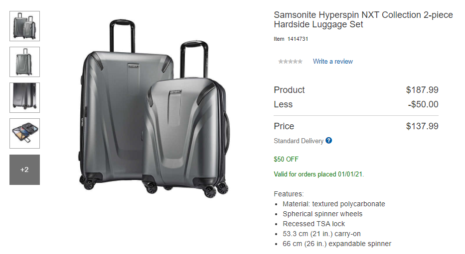 新秀丽硬边行李箱2件套:原价$187.99,折扣$137.99,省$50