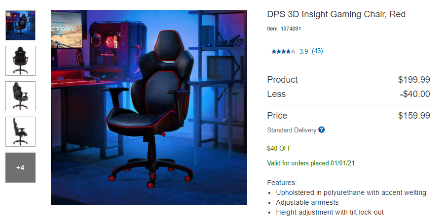 DPS 3D Insight电竞椅三色可选(红、绿、紫):原价$199.99,折扣$159.99,省$40