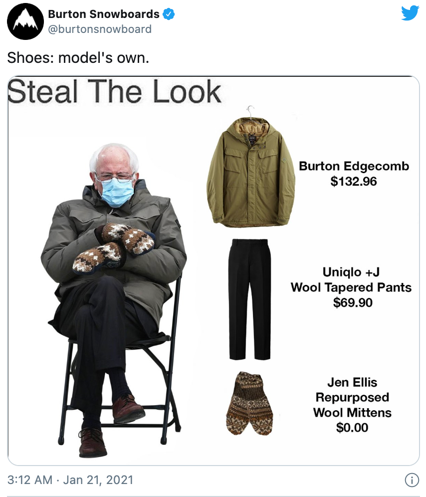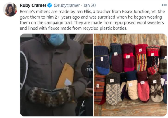 据BuzzFeed News报道,Sanders的手套是在2016年时竞选民主党总统候选人时,某学校二年级老师亲手编织并送给他的。