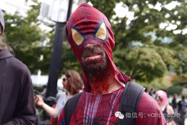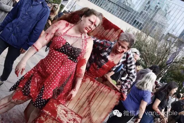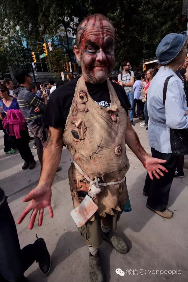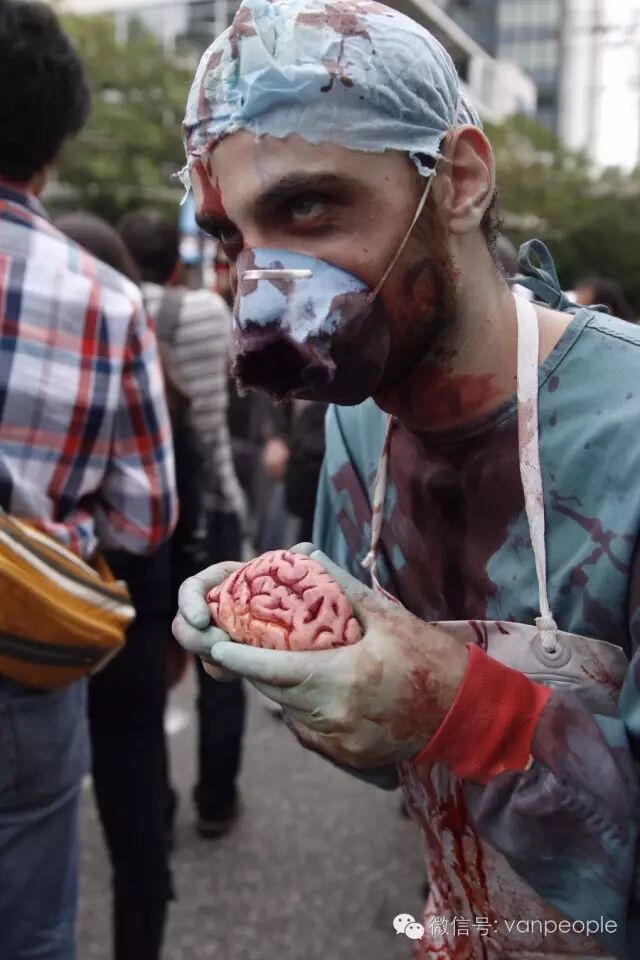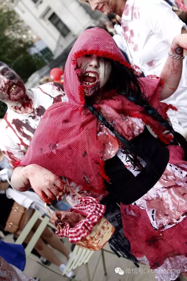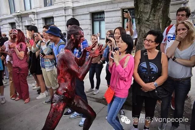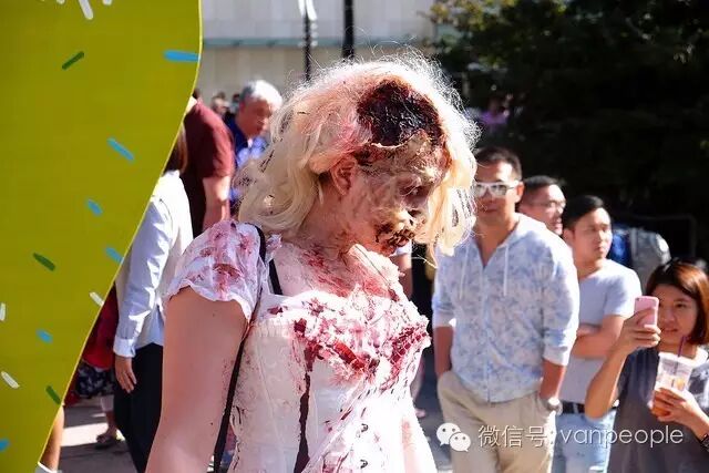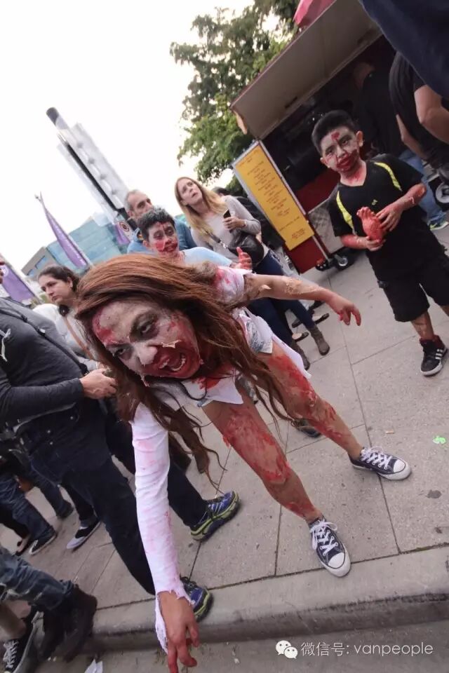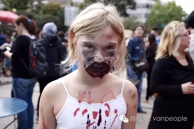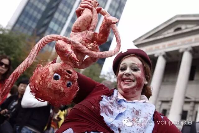 一年一度的“丧尸游行(Zombie Walk Vancouver )”昨天下午在温市中心举行,近千只经过悉心打扮,血淋淋、烂面、断手,破肚的“丧尸”步履蹒跚沿着Robson街、Denman街、一直到英吉列湾,沿途吸引近万民众观看。小编只想说:老外真会玩儿! 这个一年一度的仪式上,成千上万的“亡灵” 脸上涂抹着可怕的妆容,身上到处是滴血的伤痕,将温哥华市中心的街头彻底变成电影中大屠杀场景,而参与者和观众从中得到的乐趣和表面上的残忍和恐怖是完全成正比的。