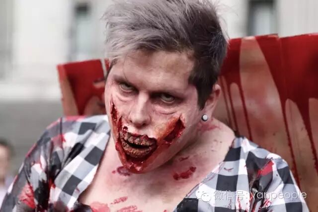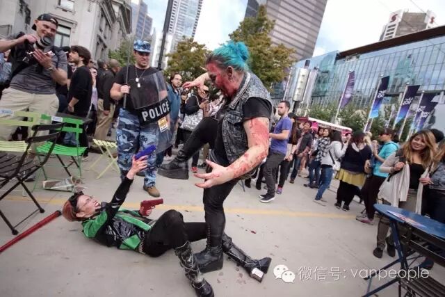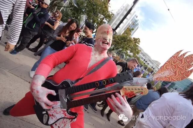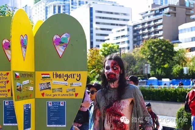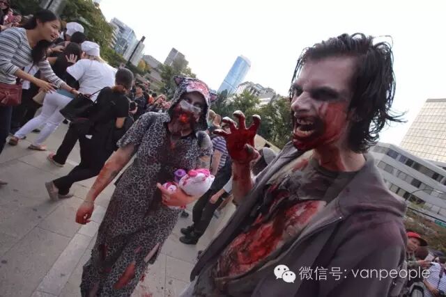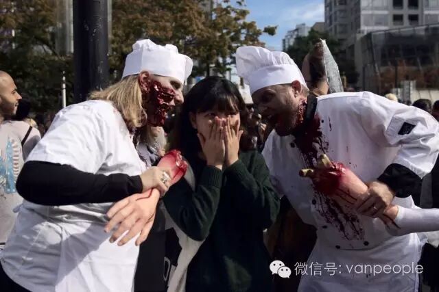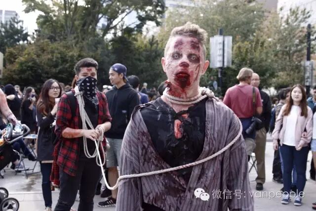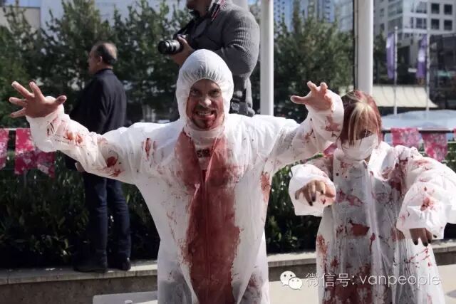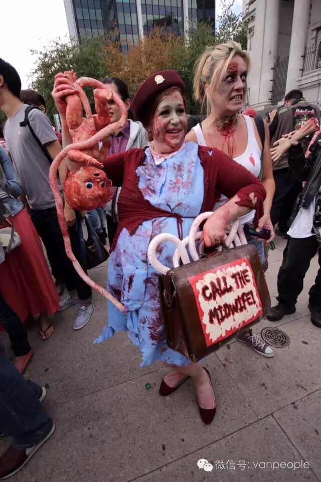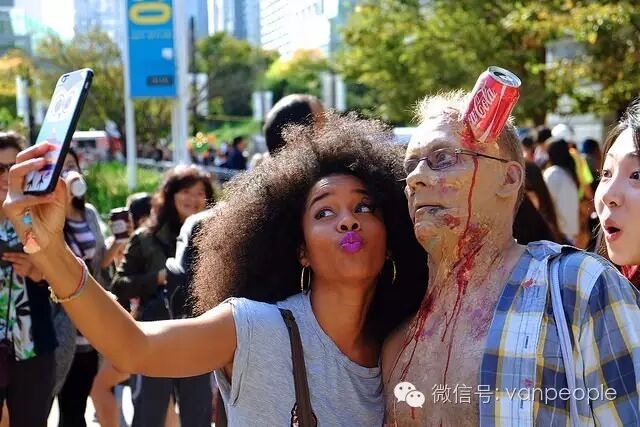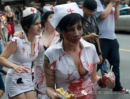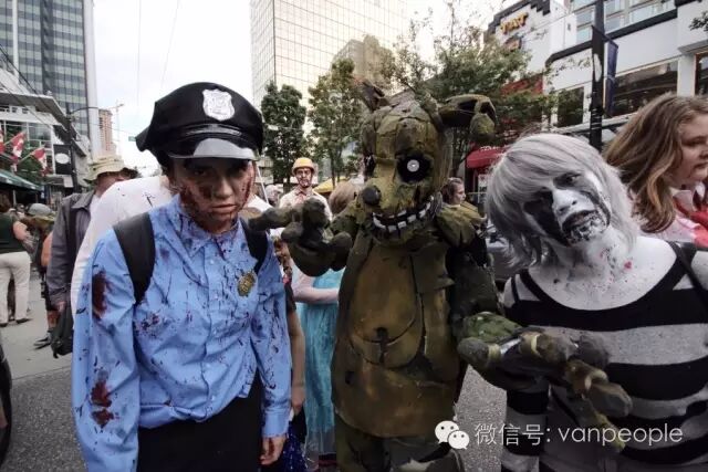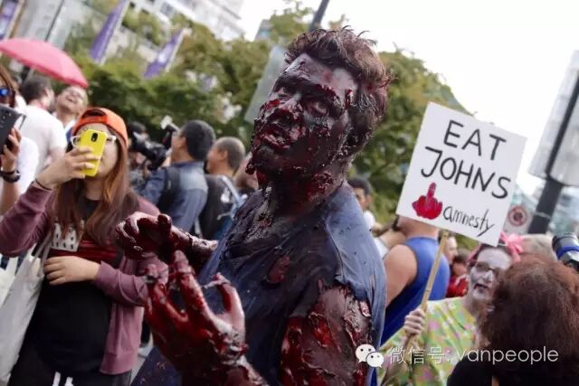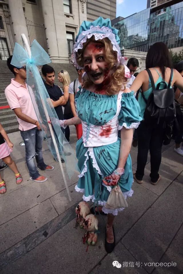 一年一度的“丧尸游行(Zombie Walk Vancouver )”昨天下午在温市中心举行,近千只经过悉心打扮,血淋淋、烂面、断手,破肚的“丧尸”步履蹒跚沿着Robson街、Denman街、一直到英吉列湾,沿途吸引近万民众观看。小编只想说:老外真会玩儿! 这个一年一度的仪式上,成千上万的“亡灵” 脸上涂抹着可怕的妆容,身上到处是滴血的伤痕,将温哥华市中心的街头彻底变成电影中大屠杀场景,而参与者和观众从中得到的乐趣和表面上的残忍和恐怖是完全成正比的。